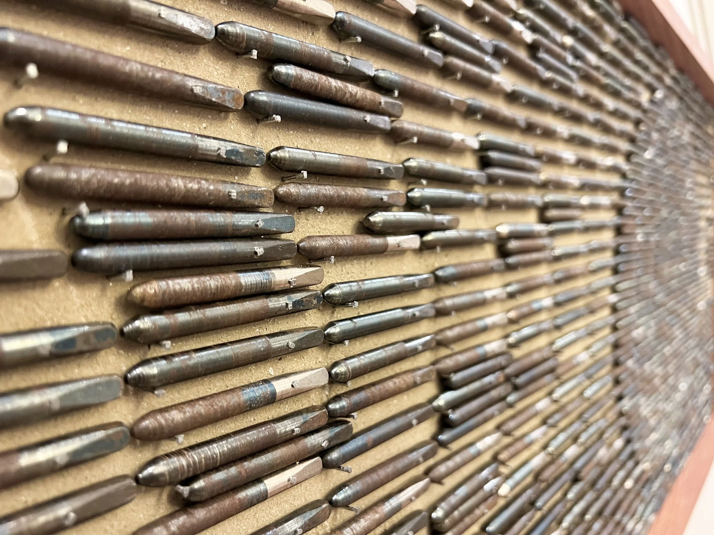 Medium: Blued steel piano tuning pins on hardwood with sand