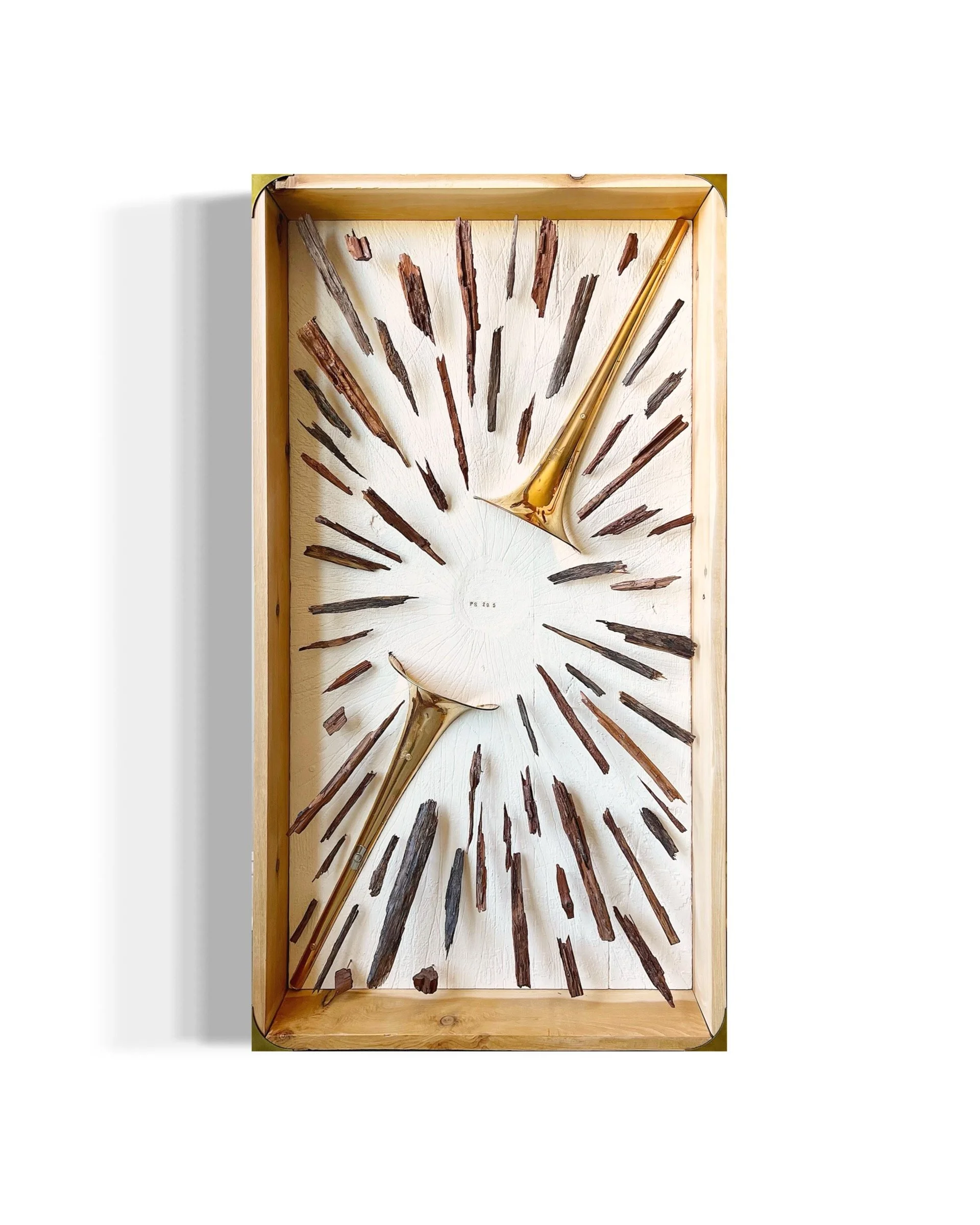 Composed of a split trombone bell and splintered cedar fragments supported by brass rods. The cedar frame is reinforced with bronze corner braces, echoing the materials within the piece. Inspired by Psalm 29:5, the work reflects the imagery of strength, breaking, and the resonant power of God’s voice.