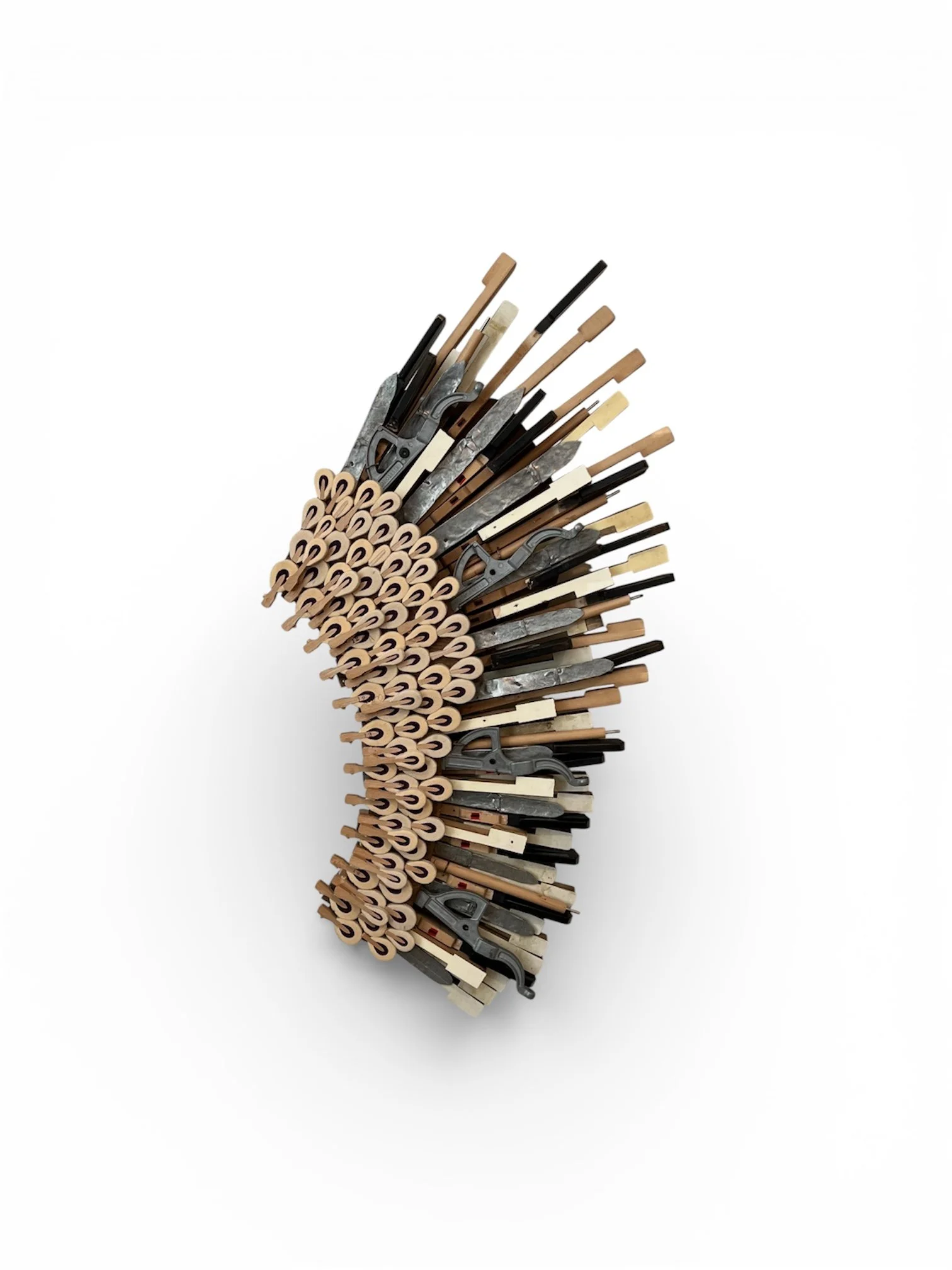 Lift is composed of elements from vintage pianos and organs, including flattened organ pipes that still bear their original note markings. The painted backdrop incorporates natural white goose feathers, a nod to the sweeping curve of an outstretched bird’s wing that inspired the piece.