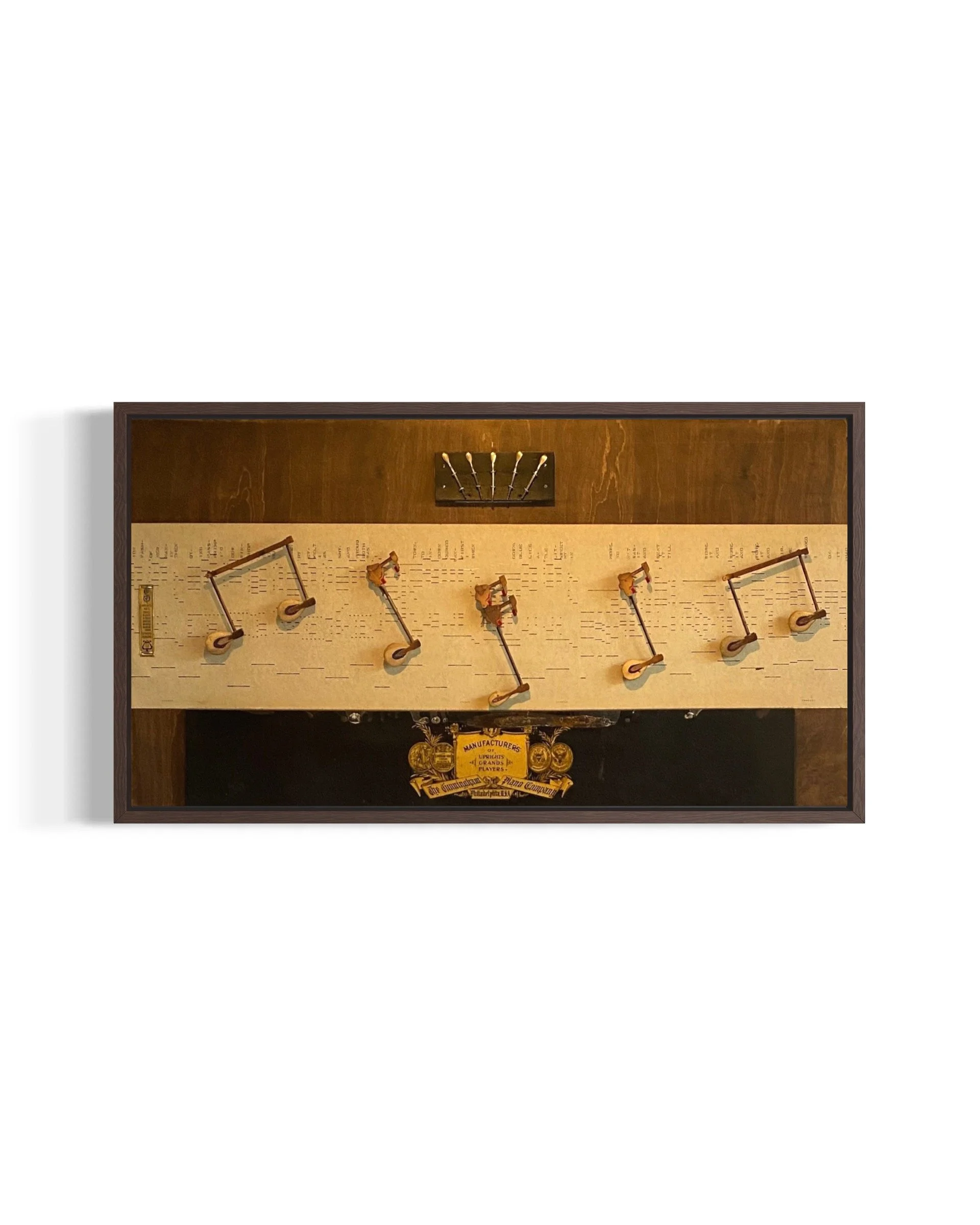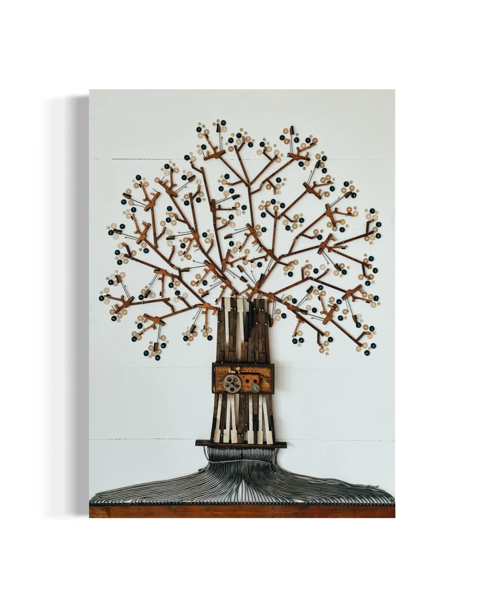Near the top of the piece, salvaged elements represent Eric, his father, and his three brothers—distinct yet connected. The background is formed from an original sheet-music scroll discovered inside the player piano, allowing the music itself to become both surface and story. The notes are constructed from components of the piano’s hammer assembly, while the base of the piece incorporates the original logo and lid of the instrument, grounding the work in its source.