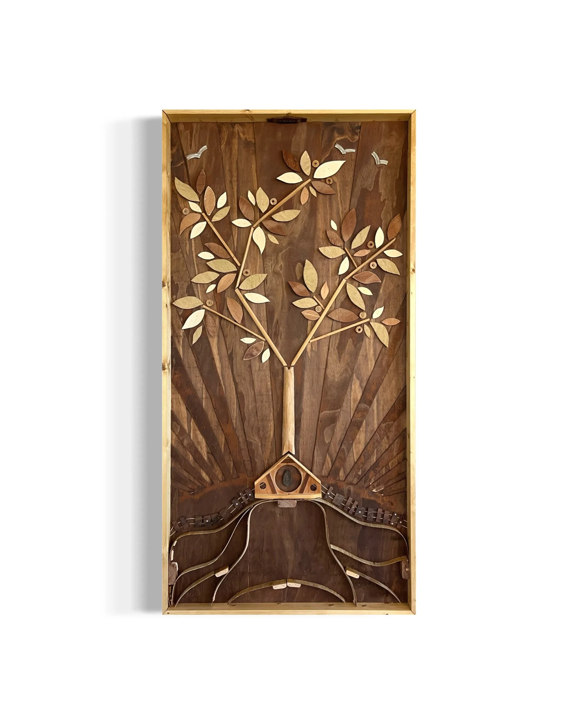 This commissioned piece was created from a single acoustic guitar mounted on a hardwood backboard. No stain was applied to the guitar itself—its varying tones were achieved by carefully sanding to different depths of the wood ply, revealing the natural beauty and texture of the instrument.